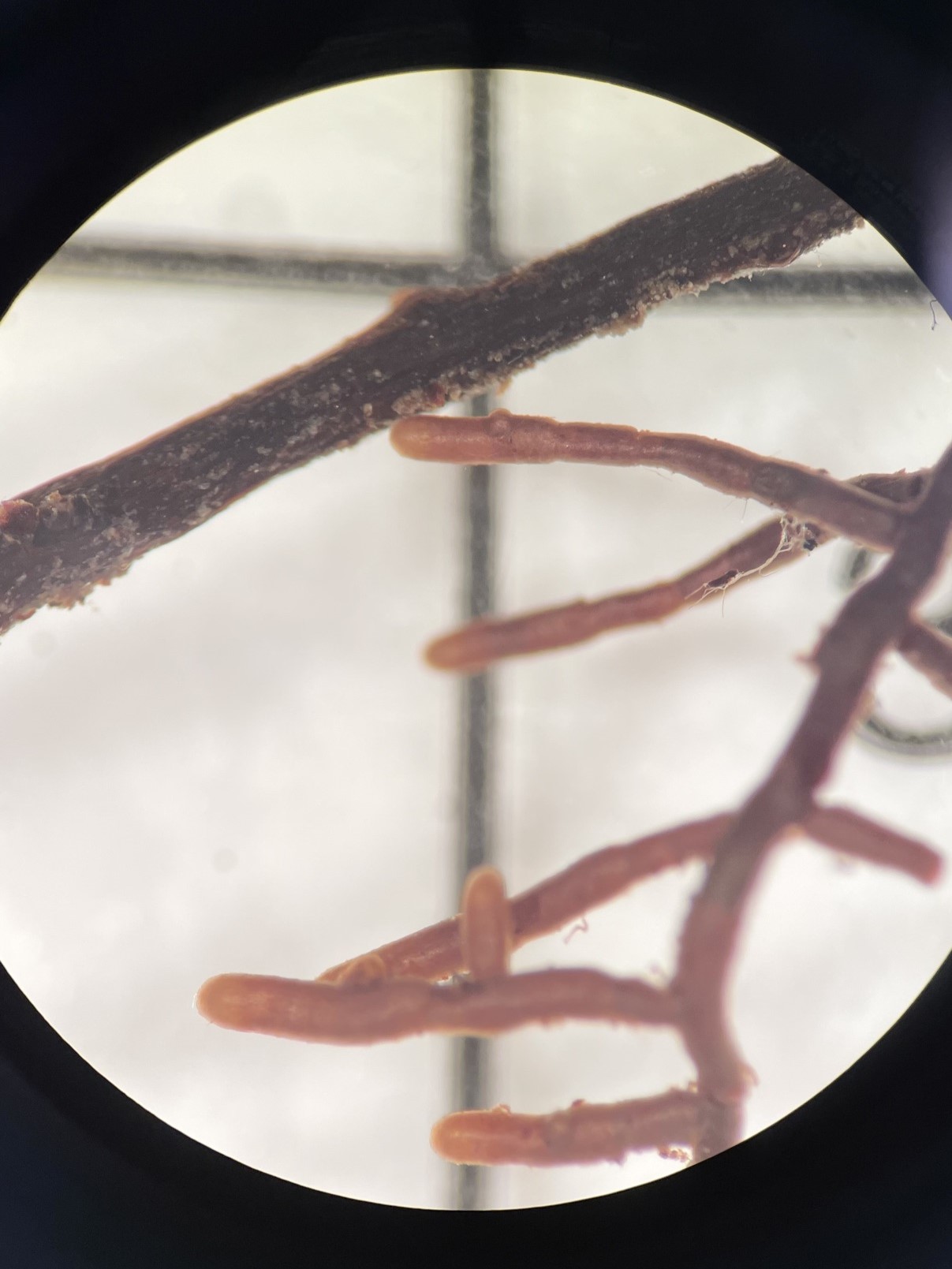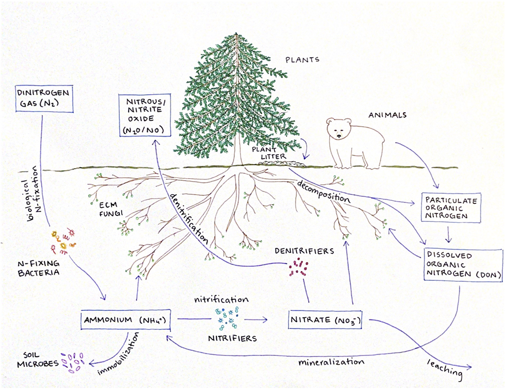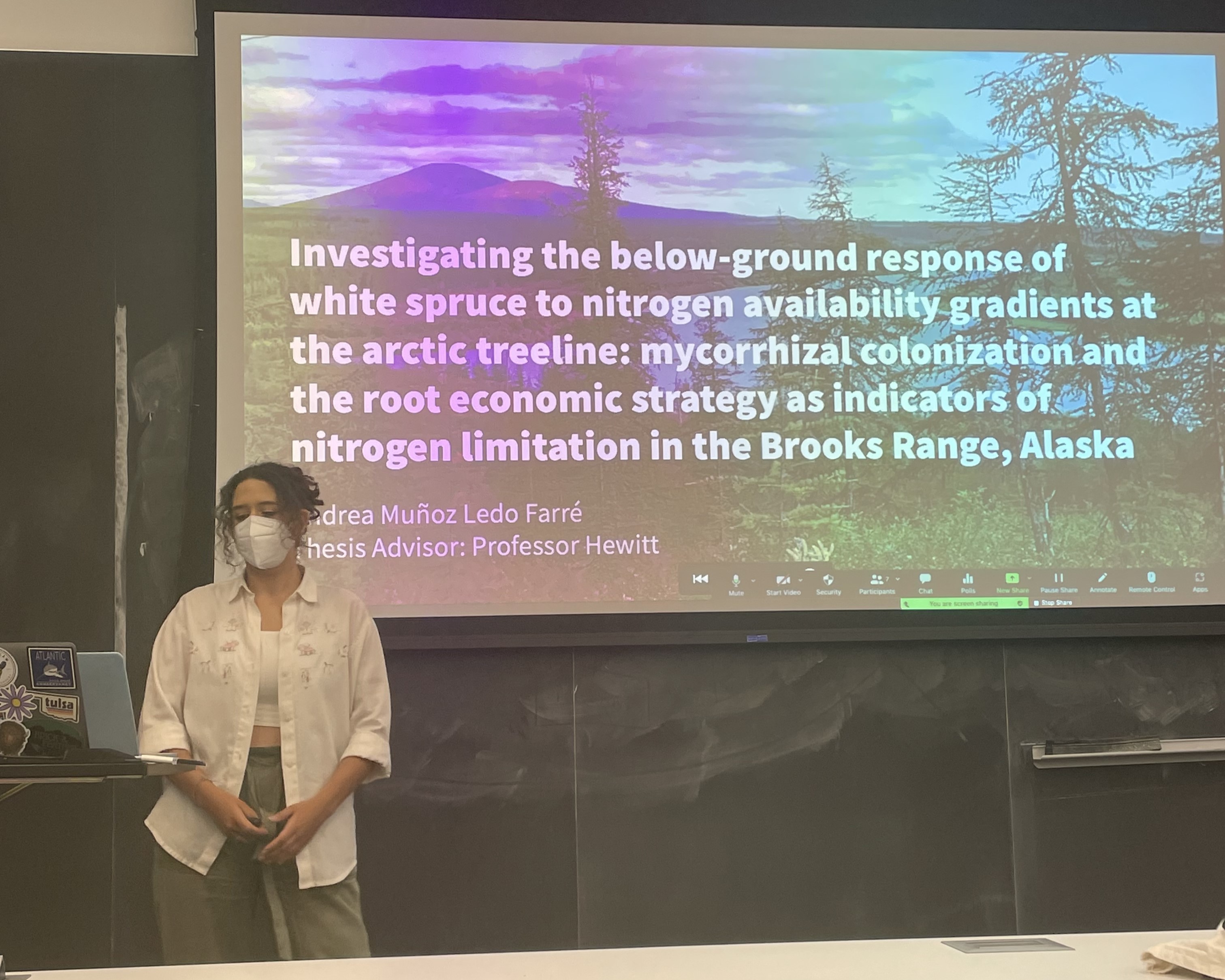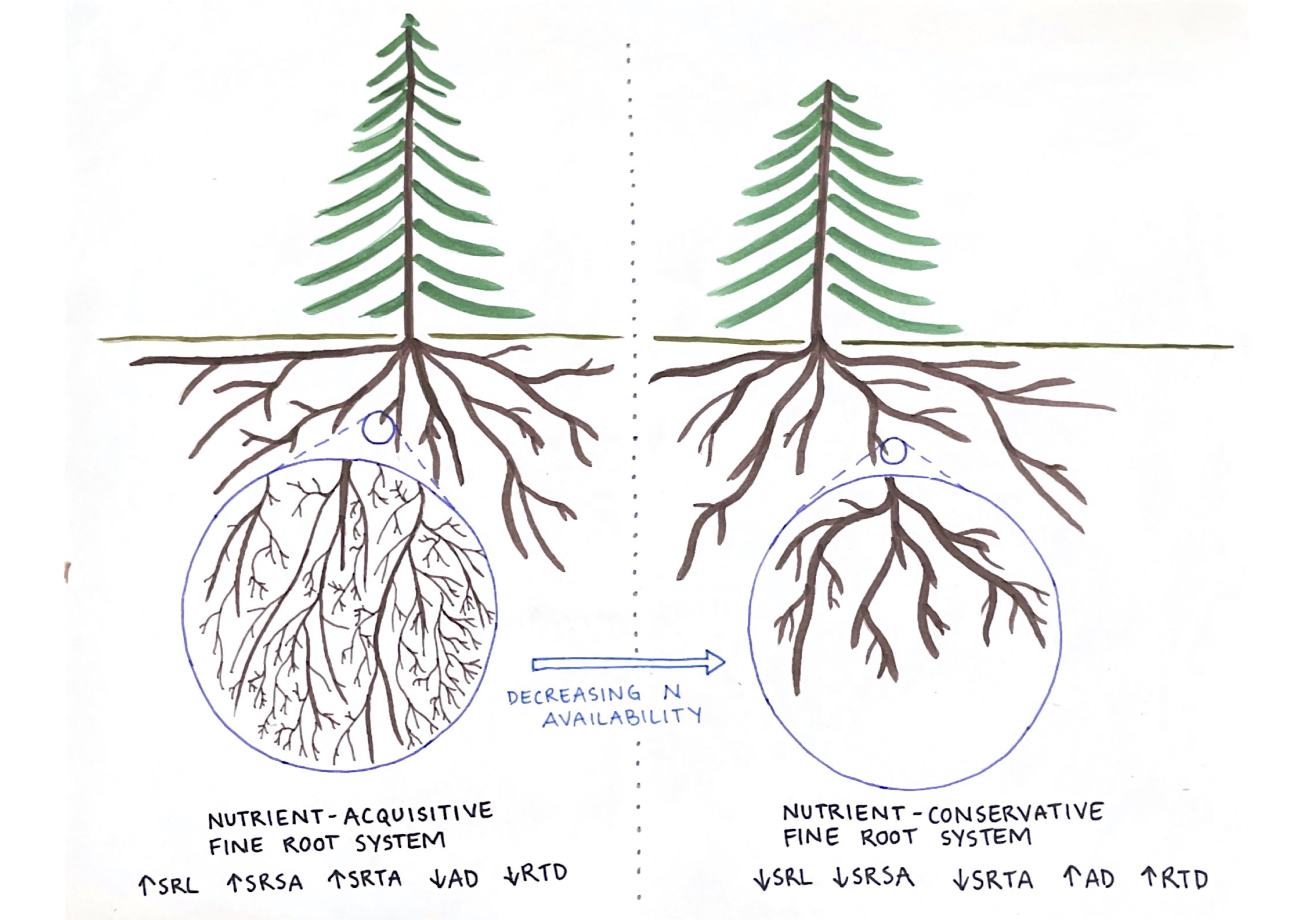 FIG. 1. The nitrogen cycle. Inspired by diagram in Chapin et al. 2011. FIG. 2. Conceptual figure of Root Economic Spectrum and root economic strategies along a nitrogen availability gradient. Fine roots depicted include: Root Tissue Density (RTD), Specific Root Tip Abundance (SRTA), Specific Root Length (SRL), Specific Root Surface Area (SRSA), Average Diameter (AD). Diagram inspired by Spitzer et al. 2020. Photos 3, 4, & 5. Laboratory setup and root samples on grid-lined petri dish for mycorrhizal colonization analysis using the point-intersect method (Brudett et al. 1996). Amherst College, Massachusetts. Photo taken by Andrea Muñoz Ledo, samples collected by Patrick Sullivan from the Coleen watershed in the Brooks Range, Alaska in the summer of 2021. Photo 6. Fine root system and root tips. The ticker, coarser root segment at the top left is not colonized by ectomycorrhizal fungi. The root tips at the bottom right are colonized. Photo taken by Andrea Muñoz Ledo, samples collected by Patrick Sullivan from the Coleen watershed in the Brooks Range, Alaska in the summer of 2021. Photo 7. Image of root analysis using WinRhizo. Root length, number of forks, root projected area, root width, root average diameter, and length-per-volume were obtained using the software program on scanned root segments. Specific root length (ratio of length to mass of fine roots; m/g), root tissue density (ratio of length per volume; g/cm3), specific root tip abundance (ratio of tips per gram of dry mass; tips/g), and specific root surface area (ratio of surface area per gram of dry mass; cm2/g) were all calculated in Excel, using the measurements from WinRhizo and the dry root mass. Photo 8. Environmental studies thesis students post-presentation.